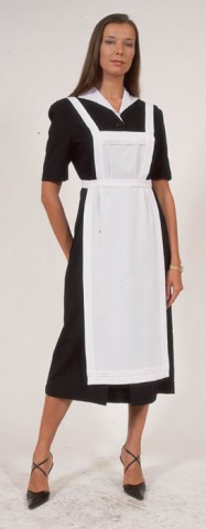 Классическая униформа горничной, это платье ниже колен темного цвета и белоснежный фартух. Платье обязательно с белым воротников, руки открыты, быть не выше колен однозначно. фартух здесь классический, старинный, на всю длину платья.